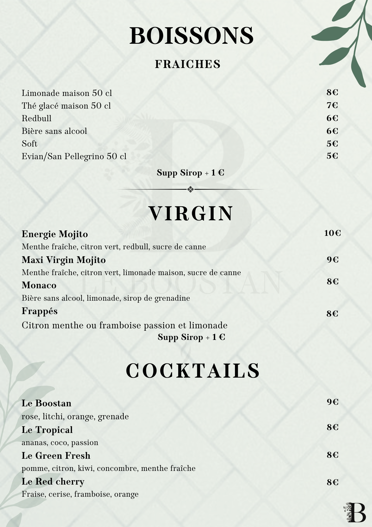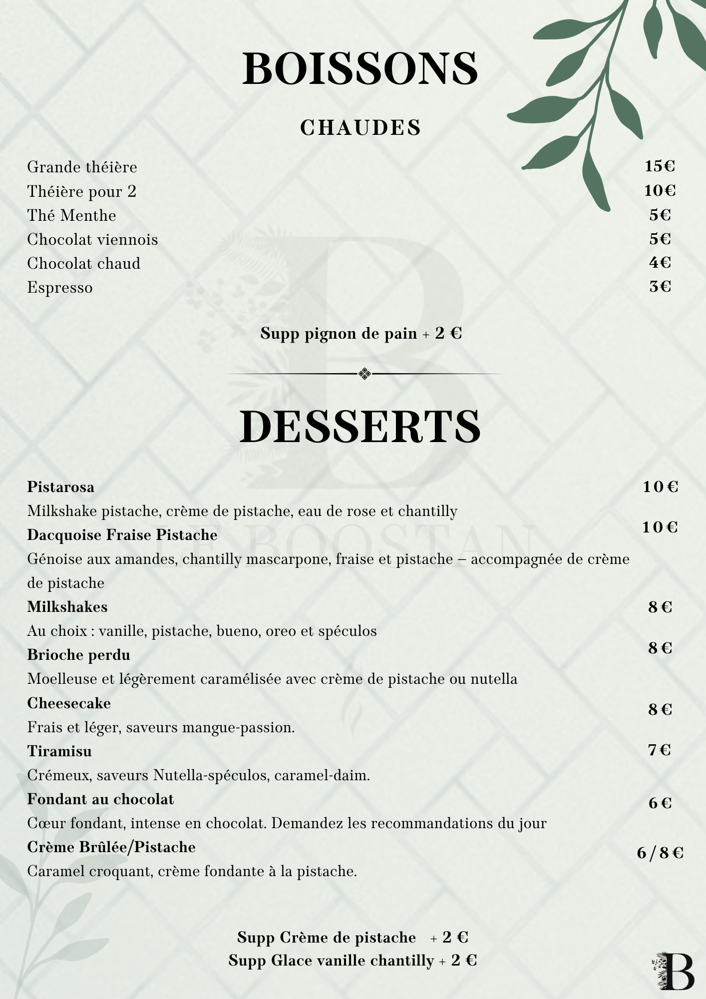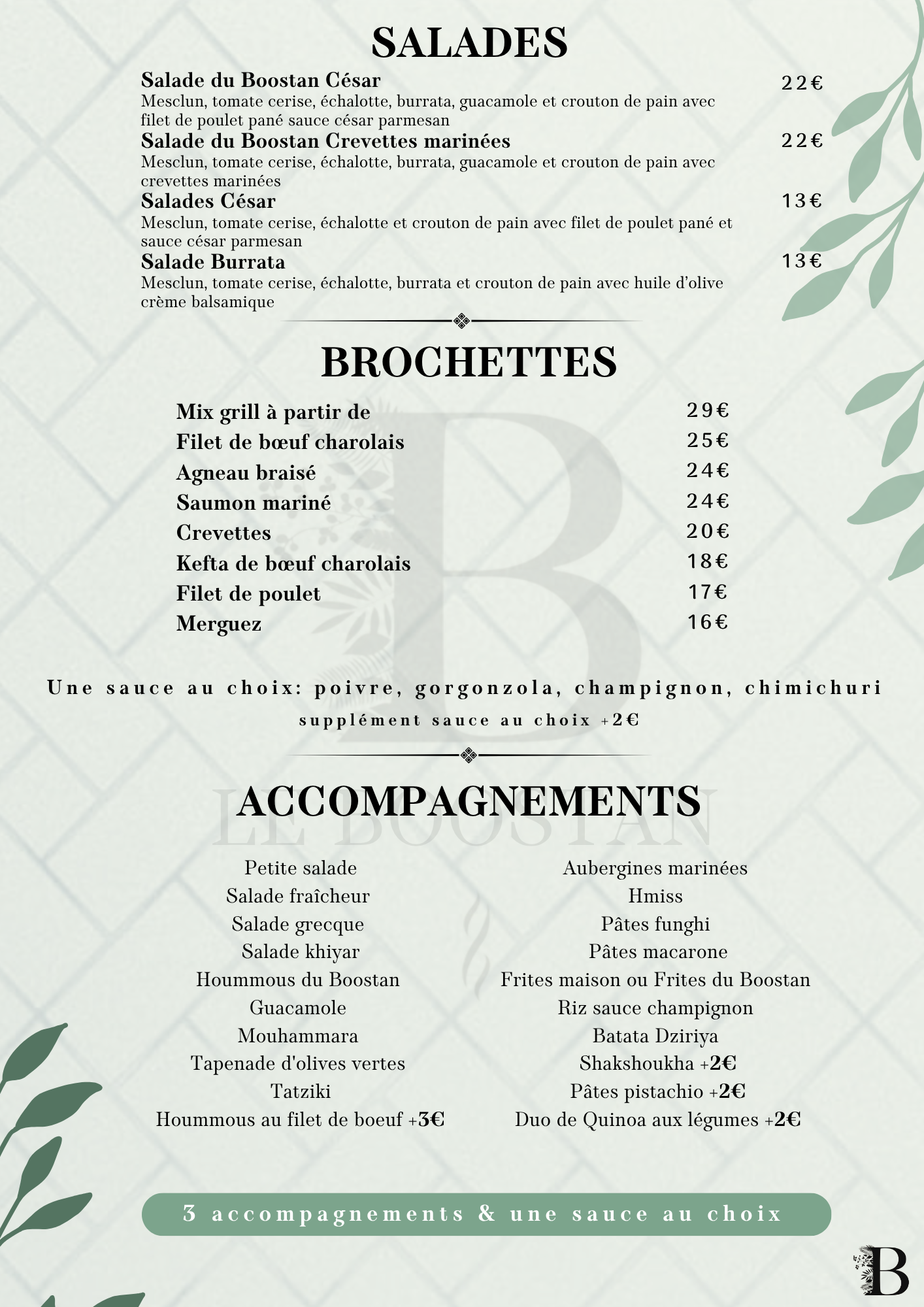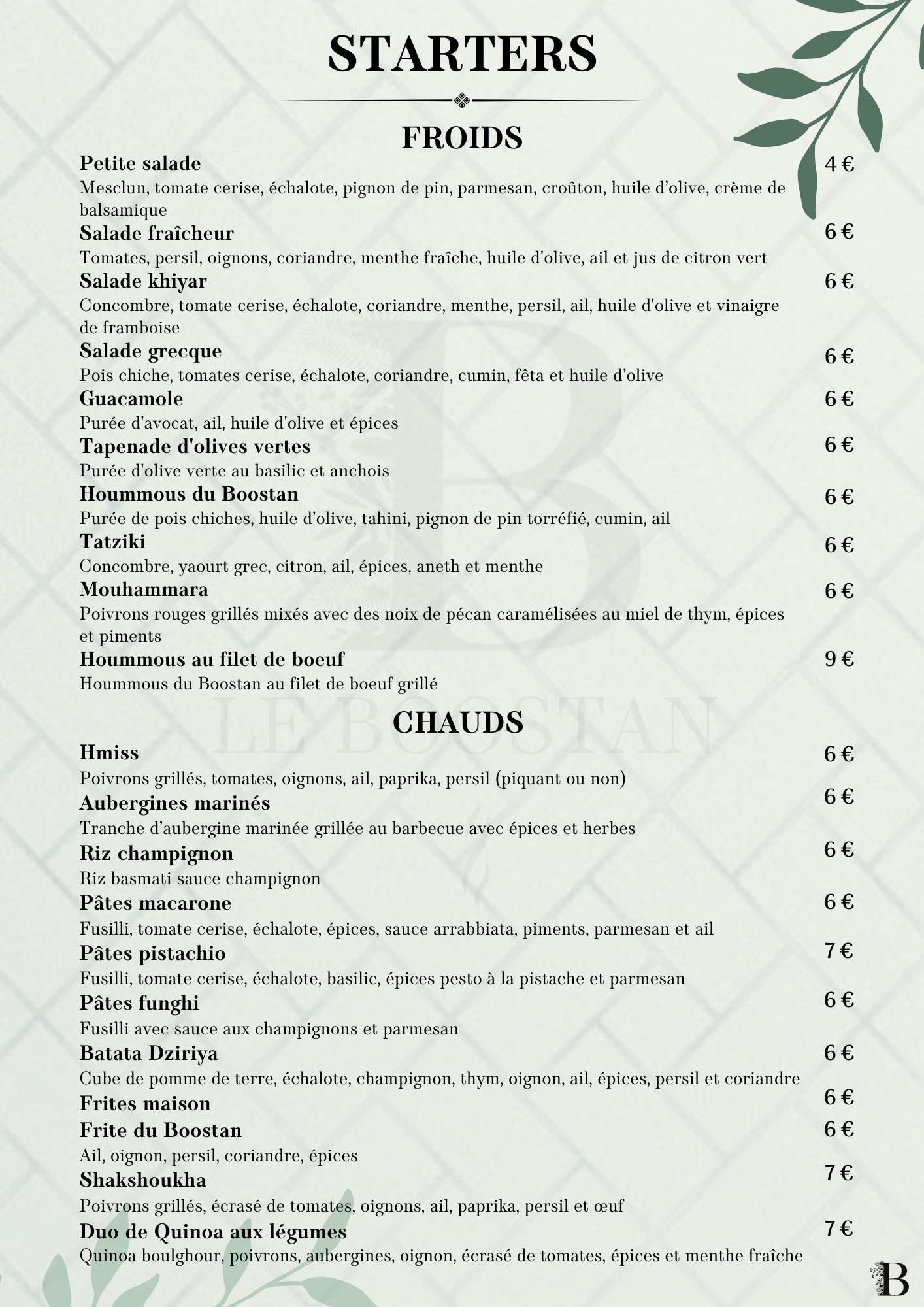 restaurant & salon de thé STARTERS Découvrir BROCHETTES Découvrir SALADES Découvrir burgers Découvrir pâtes Découvrir KIDS Découvrir desserts Découvrir boissons Découvrir narguilés Découvrir CHAUD FROID Hmiss – 6 € Poivrons grillés, tomates, oignons, ail, paprika, persil (piquant ou non) Aubergines marinés – 6 € Tranche d’aubergine marinée grillée au barbecue avec épices et herbes Riz champignon – 6 € Riz basmati sauce champignon Pâtes macarone – 6 € Fusilli, tomate cerise, échalote, épices, sauce arrabbiata, piments, parmesan et ail Pâtes pistachio – 7 € Fusilli, tomate cerise, échalote, basilic, épices pesto à la pistache et parmesan Pâtes funghi – 6 € Fusilli avec sauce aux champignons et parmesan Batata Dziriya – 6 € Cube de pomme de terre, échalote, champignon, thym, oignon, ail, épices, persil et coriandre Frites maison – 6 € Frites fraiches Frite du Boostan – 6 € Ail, oignon, persil, coriandre, épices Shakshoukha – 7 € Poivrons grillés, écrasé de tomates, oignons, ail, paprika, persil et œuf Quinoa aux légumes – 7 € Quinoa boulghour, poivrons, aubergines, oignon, écrasé de tomates, épices et menthe fraîche Petite salade – 4 € Mesclun, tomate cerise, échalote, pignon de pin, parmesan, croûton, huile d’olive, crème de balsamique Salade fraîcheur – 6 € Tomates, persil, oignons, coriandre, menthe fraîche, huile d’olive, ail et jus de citron vert Salade khiyar – 6 € Concombre, tomate cerise, échalote, coriandre, menthe, persil, ail, huile d’olive et vinaigre de framboise Salade grecque – 6 € Pois chiche, tomates cerise, échalote, coriandre, cumin, fêta et huile d’olive Guacamole – 6 € Purée d’avocat, ail, huile d’olive et épices Tapenade d’olives vertes – 6 € Mesclun, tomate cerise, échalote, pignon de pin, parmesan, croûton, huile d’olive, crème de balsamique Hoummous du Boostan – 6 € Purée de pois chiches, huile d’olive, tahini, pignon de pin torréfié, cumin, ail Tatziki – 6 € Concombre, yaourt grec, citron, ail, épices, aneth et menthe Mouhammara – 6 € Poivrons rouges grillés mixés avec des noix de pécan caramélisées au miel de thym, épices et piments Hoummous au filet de boeuf – 9 € Mesclun, tomate cerise, échalote, pignon de pin, parmesan, croûton, huile d’olive, crème de balsamique NOS VIANDES ACCOMPAGNEMENT Mix grill à partir de 29 € Voir les accompagnements Filet de bœuf charolais – 25 € Voir les accompagnements Agneau braisé – 24 € Voir les accompagnements Saumon mariné – 24 € Voir les accompagnements Crevettes – 20 € Voir les accompagnements Kefta de bœuf charolais – 18 € Voir les accompagnements Filet de poulet – 17 € Voir les accompagnements Merguez – 16 € Voir les accompagnements FROID CHAUD Petite salade Mesclun, tomate cerise, échalote, pignon de pin, parmesan, croûton, huile d’olive, crème de balsamique Salade fraîcheur Tomates, persil, oignons, coriandre, menthe fraîche, huile d’olive, ail et jus de citron vert Salade grecque Pois chiche, tomates cerise, échalote, coriandre, cumin, fêta et huile d’olive Salade khiyar Concombre, tomate cerise, échalote, coriandre, menthe, persil, ail, huile d’olive et vinaigre de framboise Hoummous du Boostan Purée de pois chiches, huile d’olive, tahini, pignon de pin torréfié, cumin, ail Guacamole Purée d’avocat, ail, huile d’olive et épices Mouhammara Poivrons rouges grillés mixés avec des noix de pécan caramélisées au miel de thym, épices et piments Tapenade d’olives vertes Purée d’olive verte au basilic et anchois Tatziki Concombre, yaourt grec, citron, ail, épices, aneth et menthe Hoummous au filet de boeuf +3€ Hoummous du Boostan au filet de boeuf grillé Aubergines marinées Tranche d’aubergine marinée grillée au barbecue avec épices et herbes Hmiss Poivrons grillés, tomates, oignons, ail, paprika, persil (piquant ou non) Pâtes funghi Fusilli avec sauce aux champignons et parmesan Pâtes macarone Fusilli, tomate cerise, échalote, épices, sauce arrabbiata, piments, parmesan et ail Frites maison Frites du Boostan Ail, oignon, persil, coriandre, épices Riz sauce champignon Riz basmati sauce champignon Batata Dziriya Cube de pomme de terre, échalote, champignon, thym, oignon, ail, épices, persil et coriandre Shakshoukha +2€ Poivrons grillés, écrasé de tomates, oignons, ail, paprika, persil et œuf Pâtes pistachio +2€ Fusilli, tomate cerise, échalote, basilic, épices pesto à la pistache et parmesan Duo de Quinoa aux légumes +2€ Quinoa boulghour, poivrons, aubergines, oignon, écrasé de tomates, épices et menthe fraîche Salade du Boostan César – 22 € Mesclun, tomate cerise, échalotte, burrata, guacamole et crouton de pain avec filet de poulet pané sauce césar parmesan Salade du Boostan Crevettes marinées – 22 € Mesclun, tomate cerise, échalotte, burrata, guacamole et crouton de pain avec crevettes marinées Salade du Boostan Saumon mariné – 24 € Mesclun, tomate cerise, échalotte, burrata, guacamole et crouton de pain avec pavé de saumon mariné Salades César – 13 € Mesclun, tomate cerise, échalotte et crouton de pain avec filet de poulet pané et sauce césar parmesan Salade Burrata– 13 € Mesclun, tomate cerise, échalotte, burrata et crouton de pain avec huile d’olive crème balsamique Le classique – 15 € Pain brioché, Boeuf hachée, Mayonnaise, Ketchup, Salades, tomates, échalotes, Cornichons, CheddarSupp Steak + 3 € le charolais – 25 € Pain brioché, Filet de bœuf, Confis d’oignons rouge, Salades, tomates, échalotes, Tatziki, Cheddar le boostan – 19 € Pain brioché, Bœuf hachée, Houmous maison, Salade fraîcheur, Tomates, CheddarSupp Steak + 3 € Champignon – 15 € Pates fusilli, parmesan, coriandre, échalotte, sauce et viande au choix-POULET-FILET DE BOEUF + 5 € Gorgonzola – 15 € Pates fusilli, par