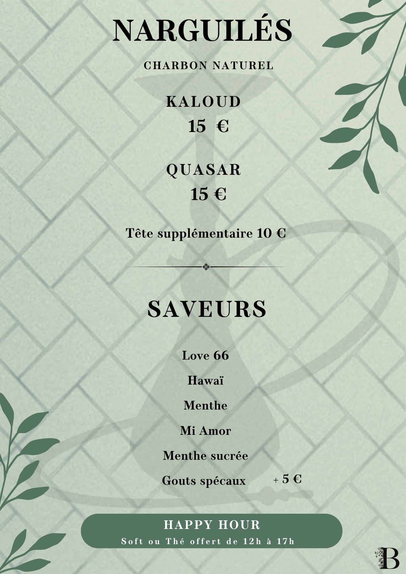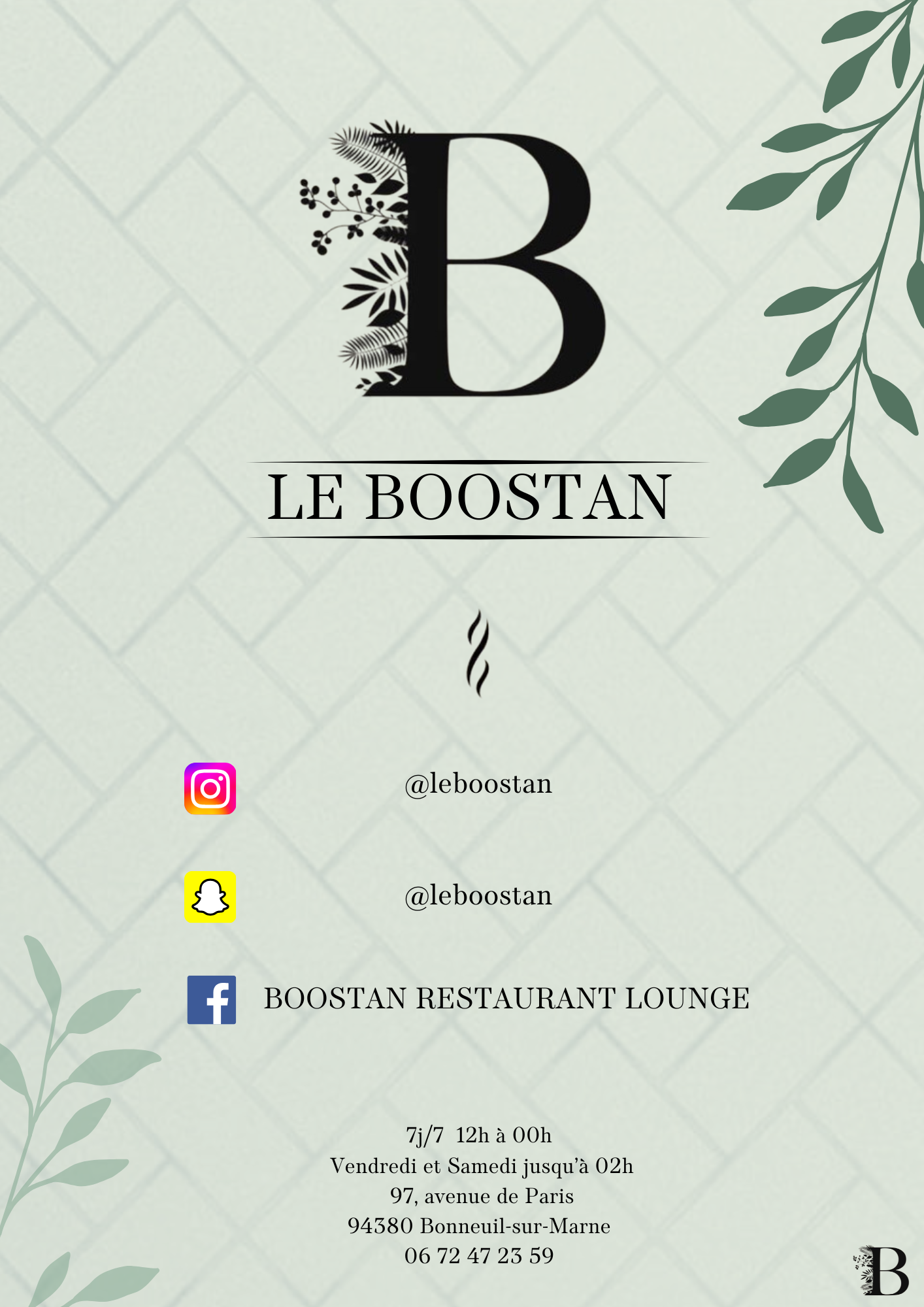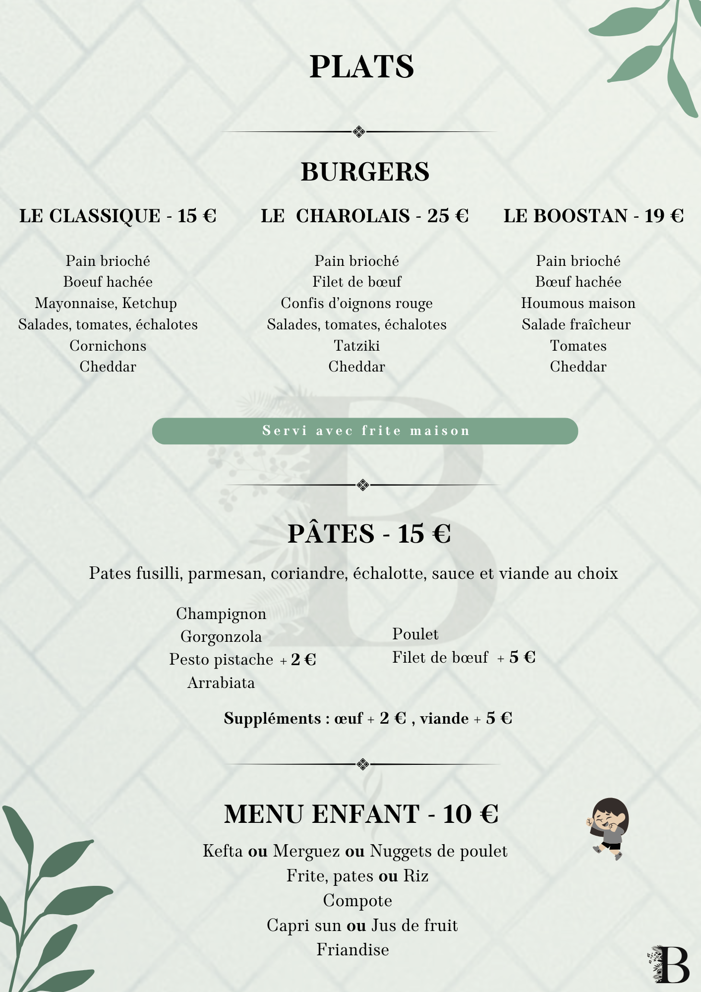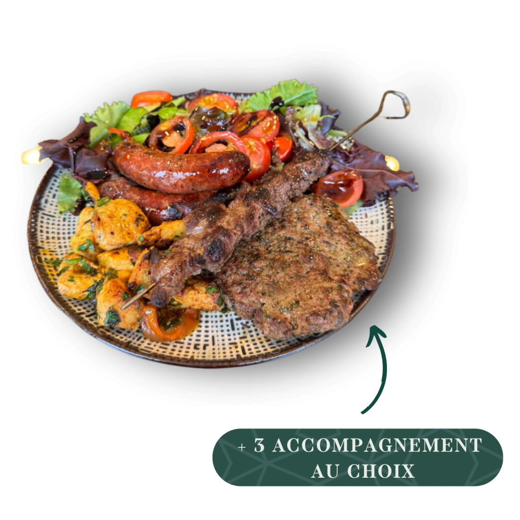 restaurant & salon de thé STARTERS Découvrir BROCHETTES Découvrir SALADES Découvrir burgers Découvrir pâtes Découvrir KIDS Découvrir desserts Découvrir boissons Découvrir narguilés Découvrir CHAUD FROID Hmiss – 6 € Poivrons grillés, tomates, oignons, ail, paprika, persil (piquant ou non) Aubergines marinés – 6 € Tranche d’aubergine marinée grillée au barbecue avec épices et herbes Riz champignon – 6 € Riz basmati sauce champignon Pâtes macarone – 6 € Fusilli, tomate cerise, échalote, épices, sauce arrabbiata, piments, parmesan et ail Pâtes pistachio – 7 € Fusilli, tomate cerise, échalote, basilic, épices pesto à la pistache et parmesan Pâtes funghi – 6 € Fusilli avec sauce aux champignons et parmesan Batata Dziriya – 6 € Cube de pomme de terre, échalote, champignon, thym, oignon, ail, épices, persil et coriandre Frites maison – 6 € Frites fraiches Frite du Boostan – 6 € Ail, oignon, persil, coriandre, épices Shakshoukha – 7 € Poivrons grillés, écrasé de tomates, oignons, ail, paprika, persil et œuf Quinoa aux légumes – 7 € Quinoa boulghour, poivrons, aubergines, oignon, écrasé de tomates, épices et menthe fraîche Petite salade – 4 € Mesclun, tomate cerise, échalote, pignon de pin, parmesan, croûton, huile d’olive, crème de balsamique Salade fraîcheur – 6 € Tomates, persil, oignons, coriandre, menthe fraîche, huile d’olive, ail et jus de citron vert Salade khiyar – 6 € Concombre, tomate cerise, échalote, coriandre, menthe, persil, ail, huile d’olive et vinaigre de framboise Salade grecque – 6 € Pois chiche, tomates cerise, échalote, coriandre, cumin, fêta et huile d’olive Guacamole – 6 € Purée d’avocat, ail, huile d’olive et épices Tapenade d’olives vertes – 6 € Mesclun, tomate cerise, échalote, pignon de pin, parmesan, croûton, huile d’olive, crème de balsamique Hoummous du Boostan – 6 € Purée de pois chiches, huile d’olive, tahini, pignon de pin torréfié, cumin, ail Tatziki – 6 € Concombre, yaourt grec, citron, ail, épices, aneth et menthe Mouhammara – 6 € Poivrons rouges grillés mixés avec des noix de pécan caramélisées au miel de thym, épices et piments Hoummous au filet de boeuf – 9 € Mesclun, tomate cerise, échalote, pignon de pin, parmesan, croûton, huile d’olive, crème de balsamique NOS VIANDES ACCOMPAGNEMENT Mix grill à partir de 29 € Voir les accompagnements Filet de bœuf charolais – 25 € Voir les accompagnements Agneau braisé – 24 € Voir les accompagnements Saumon mariné – 24 € Voir les accompagnements Crevettes – 20 € Voir les accompagnements Kefta de bœuf charolais – 18 € Voir les accompagnements Filet de poulet – 17 € Voir les accompagnements Merguez – 16 € Voir les accompagnements FROID CHAUD Petite salade Mesclun, tomate cerise, échalote, pignon de pin, parmesan, croûton, huile d’olive, crème de balsamique Salade fraîcheur Tomates, persil, oignons, coriandre, menthe fraîche, huile d’olive, ail et jus de citron vert Salade grecque Pois chiche, tomates cerise, échalote, coriandre, cumin, fêta et huile d’olive Salade khiyar Concombre, tomate cerise, échalote, coriandre, menthe, persil, ail, huile d’olive et vinaigre de framboise Hoummous du Boostan Purée de pois chiches, huile d’olive, tahini, pignon de pin torréfié, cumin, ail Guacamole Purée d’avocat, ail, huile d’olive et épices Mouhammara Poivrons rouges grillés mixés avec des noix de pécan caramélisées au miel de thym, épices et piments Tapenade d’olives vertes Purée d’olive verte au basilic et anchois Tatziki Concombre, yaourt grec, citron, ail, épices, aneth et menthe Hoummous au filet de boeuf +3€ Hoummous du Boostan au filet de boeuf grillé Aubergines marinées Tranche d’aubergine marinée grillée au barbecue avec épices et herbes Hmiss Poivrons grillés, tomates, oignons, ail, paprika, persil (piquant ou non) Pâtes funghi Fusilli avec sauce aux champignons et parmesan Pâtes macarone Fusilli, tomate cerise, échalote, épices, sauce arrabbiata, piments, parmesan et ail Frites maison Frites du Boostan Ail, oignon, persil, coriandre, épices Riz sauce champignon Riz basmati sauce champignon Batata Dziriya Cube de pomme de terre, échalote, champignon, thym, oignon, ail, épices, persil et coriandre Shakshoukha +2€ Poivrons grillés, écrasé de tomates, oignons, ail, paprika, persil et œuf Pâtes pistachio +2€ Fusilli, tomate cerise, échalote, basilic, épices pesto à la pistache et parmesan Duo de Quinoa aux légumes +2€ Quinoa boulghour, poivrons, aubergines, oignon, écrasé de tomates, épices et menthe fraîche Salade du Boostan César – 22 € Mesclun, tomate cerise, échalotte, burrata, guacamole et crouton de pain avec filet de poulet pané sauce césar parmesan Salade du Boostan Crevettes marinées – 22 € Mesclun, tomate cerise, échalotte, burrata, guacamole et crouton de pain avec crevettes marinées Salade du Boostan Saumon mariné – 24 € Mesclun, tomate cerise, échalotte, burrata, guacamole et crouton de pain avec pavé de saumon mariné Salades César – 13 € Mesclun, tomate cerise, échalotte et crouton de pain avec filet de poulet pané et sauce césar parmesan Salade Burrata– 13 € Mesclun, tomate cerise, échalotte, burrata et crouton de pain avec huile d’olive crème balsamique Le classique – 15 € Pain brioché, Boeuf hachée, Mayonnaise, Ketchup, Salades, tomates, échalotes, Cornichons, CheddarSupp Steak + 3 € le charolais – 25 € Pain brioché, Filet de bœuf, Confis d’oignons rouge, Salades, tomates, échalotes, Tatziki, Cheddar le boostan – 19 € Pain brioché, Bœuf hachée, Houmous maison, Salade fraîcheur, Tomates, CheddarSupp Steak + 3 € Champignon – 15 € Pates fusilli, parmesan, coriandre, échalotte, sauce et viande au choix-POULET-FILET DE BOEUF + 5 € Gorgonzola – 15 € Pates fusilli, par